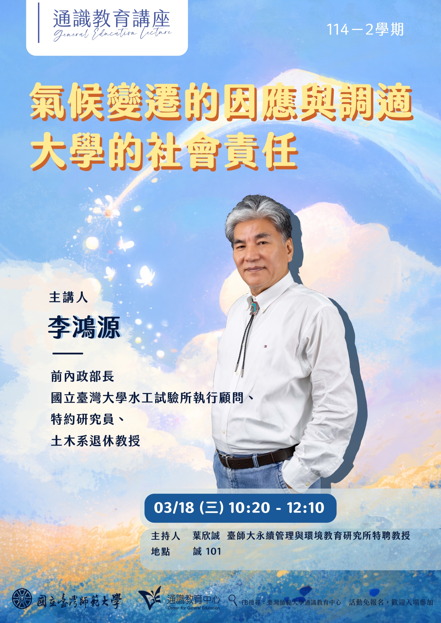 國立臺灣大學土木工程學系退休教授主持人:葉欣誠 教授國立臺灣師範大學永續管理與環境教育研究所特聘教授講座簡介面對日益嚴峻的極端天氣威脅,大學應如何運用專業研究能量落實社會責任?本次講座特別邀請李鴻源教授,從國土韌性與永續發展的視角,深度剖析臺灣面臨的挑戰與因應策略。